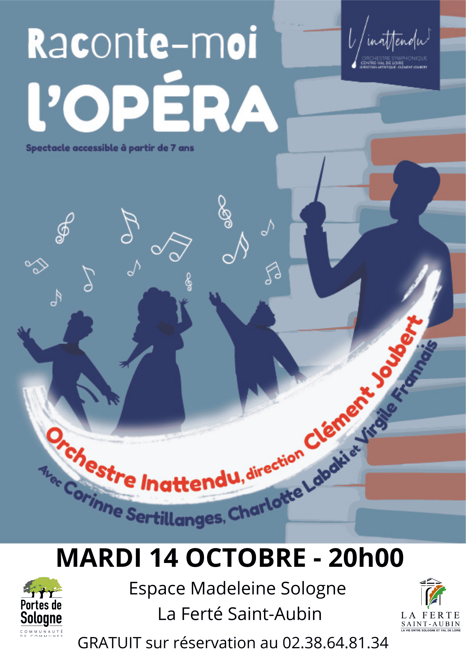 Deux séances du spectacle « Raconte-moi l’Opéra » de l’Orchestre l’Inattendu seront proposées l’après-midi aux élèves des classes de CE1 aux CM2 de la Communauté de Communes des Portes de Sologne, ainsi qu’aux élèves de 6ème du collège Le Pré des Rois. Ainsi, des jeunes élèves pourront découvrir ou redécouvrir l’Opéra à travers un spectacle de qualité et à la renommée certaine.
